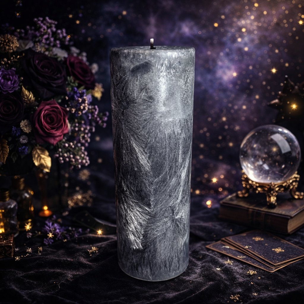 Dnes pro tebe máme něco výjimečného. Tato vysoká, magická šedivo-stříbrná svíčka voní jako tajemná noc plná zázraků.