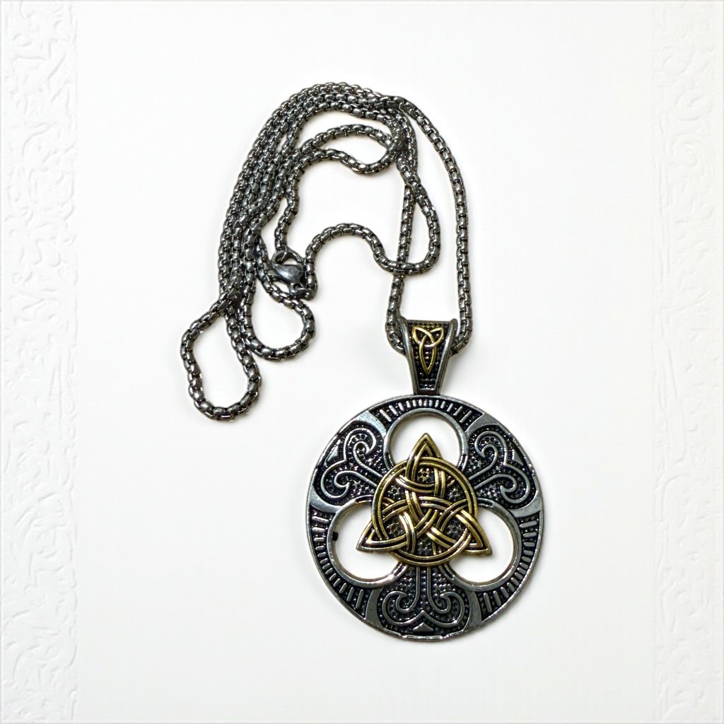 Zlatý trojitý uzel (triquetra) ve středu je kód čarodějek – znamení propojení duše, těla a ducha. Když ho máš na sobě, Vesmír ví, že patříš ke Světlu.