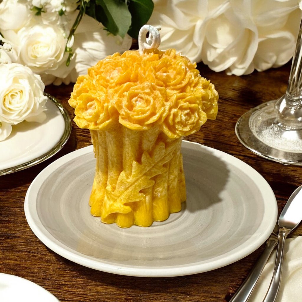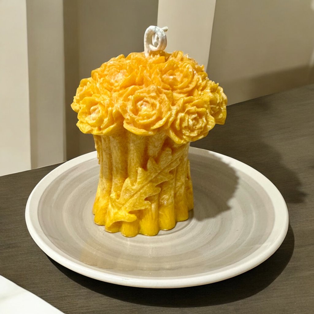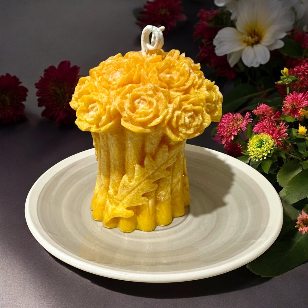 Svíčka jako zlatý věnec požehnání. Růže, které ji korunují, v sobě nesou vzkaz o radosti, hojnosti a splněných přáních. Je to poděkování vesmíru za vše dobré – a zároveň jemné pozvání k tomu, aby přišlo ještě víc krásného.