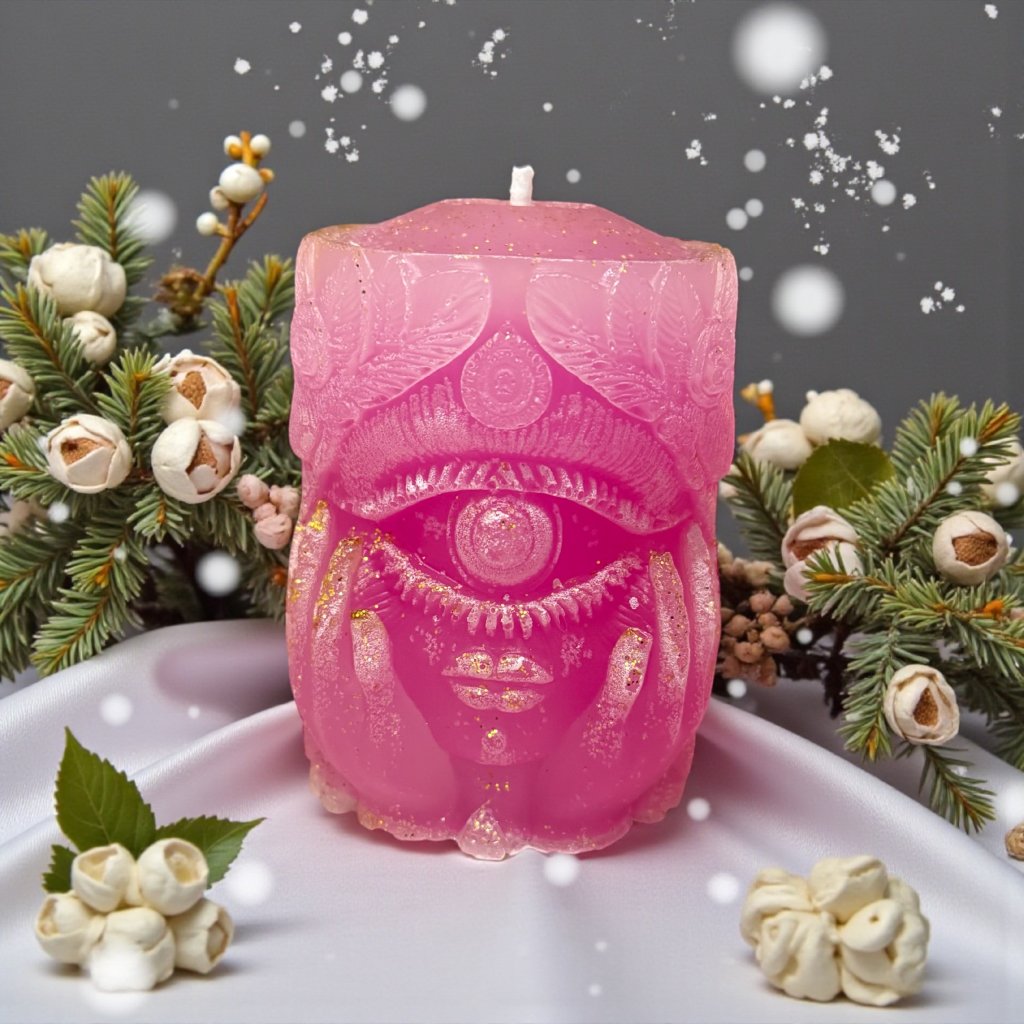 V zimním tichu, tam kde padá sníh a svět se zpomaluje, se probouzí tahle růžová svíčka — ale ne ledajaká. Je to svíčka, která nese oko poznání, oko lásky a oko pravého vesmírného vedení… 💞✨