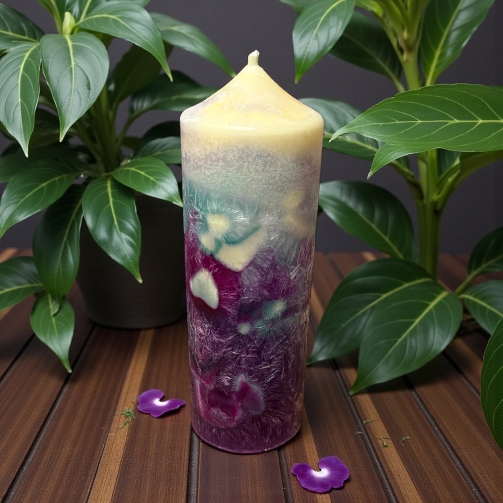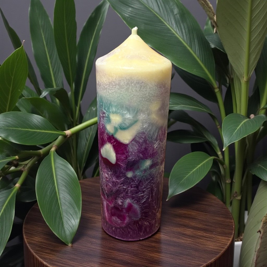 (Unikátní fialovo-bílo-mint-růžová svíčka s vůní Lilie, Růže a Skořice)