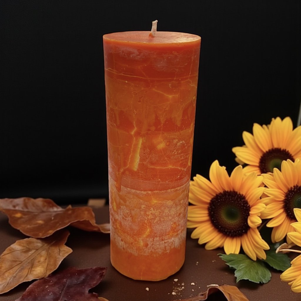 Svíčka je velká rituální, v barvě oranžového podzimního světla.