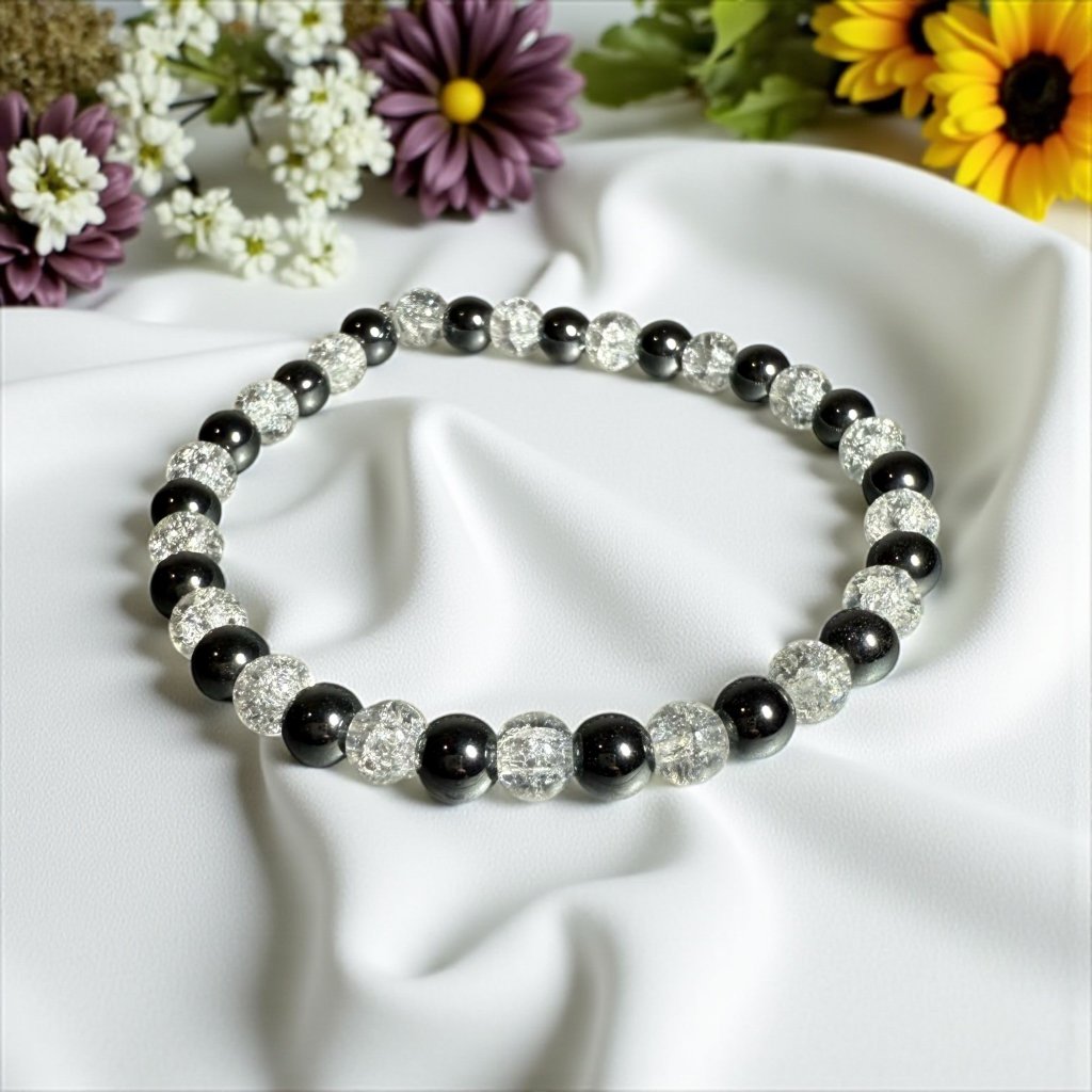 Spojení pukaného křišťálu a hematitu vytváří velmi silný štít. Tento náramek nepustí k tvému životu žádné špatné zprávy, žádné negativní události. Chrání tě, když máš pocit, že „se něco děje“ nebo že hrozí nepříjemné změny. Je jako tichý strážce, který stojí mezi tebou a tím, co by ti mohlo ublížit.