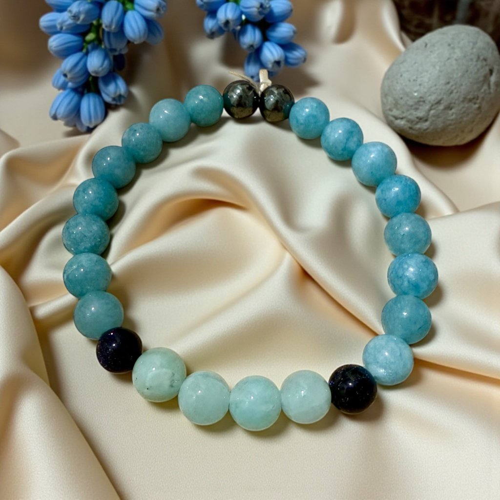 Tenhle náramek je jako ochranný štít i kompas zároveň. Hematit tě chrání před závistí a falešnými úmysly, zatímco akvamarín uklidňuje mysl a přináší odvahu čelit tomu, co tě tíží. Hvězdný avanturín nakonec jemně napojuje na vyšší vedení – jako by ti vesmír začal šeptat správným směrem.