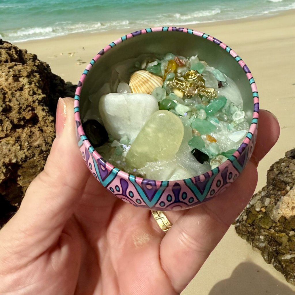 Uvnitř najdeš výběr polodrahokamů, krystaly ze Sicílie a křišťál jako zesilovač záměru. Kapka esenciálního oleje a svěcená voda mu dodávají posvátnou vibraci a příjemnou vůni, která propojuje smysly s vnitřní vírou v hojnost.