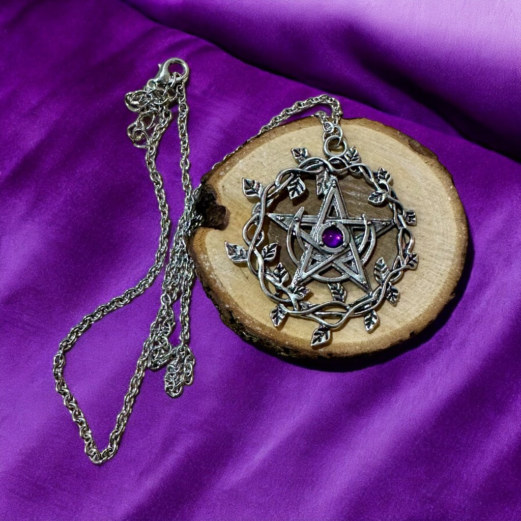 Tento nádherný pentagram s fialovým kamínkem je magický talisman, který nabízí silnou ochranu před všemi negativními vlivy, a zároveň volá do života pomoc a podporu od vesmíru a vyšších sil. Fialový kamínek symbolizuje korunní čakru, která je centrem intuice, tušení a vědění. Tento amulet napomáhá posílení vaší intuice a hlubšího pochopení situací, které vás v životě obklopují ✨🔮.