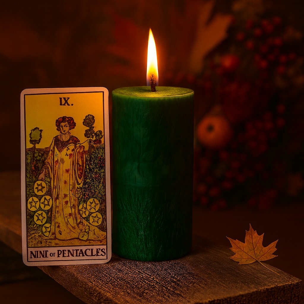 🪄 Tato svíčka byla vyrobena pod tarotovou kartou DEVĚT PENTAKLŮ – symbolem samostatnosti, hojnosti a štěstí, které přichází jako odměna.