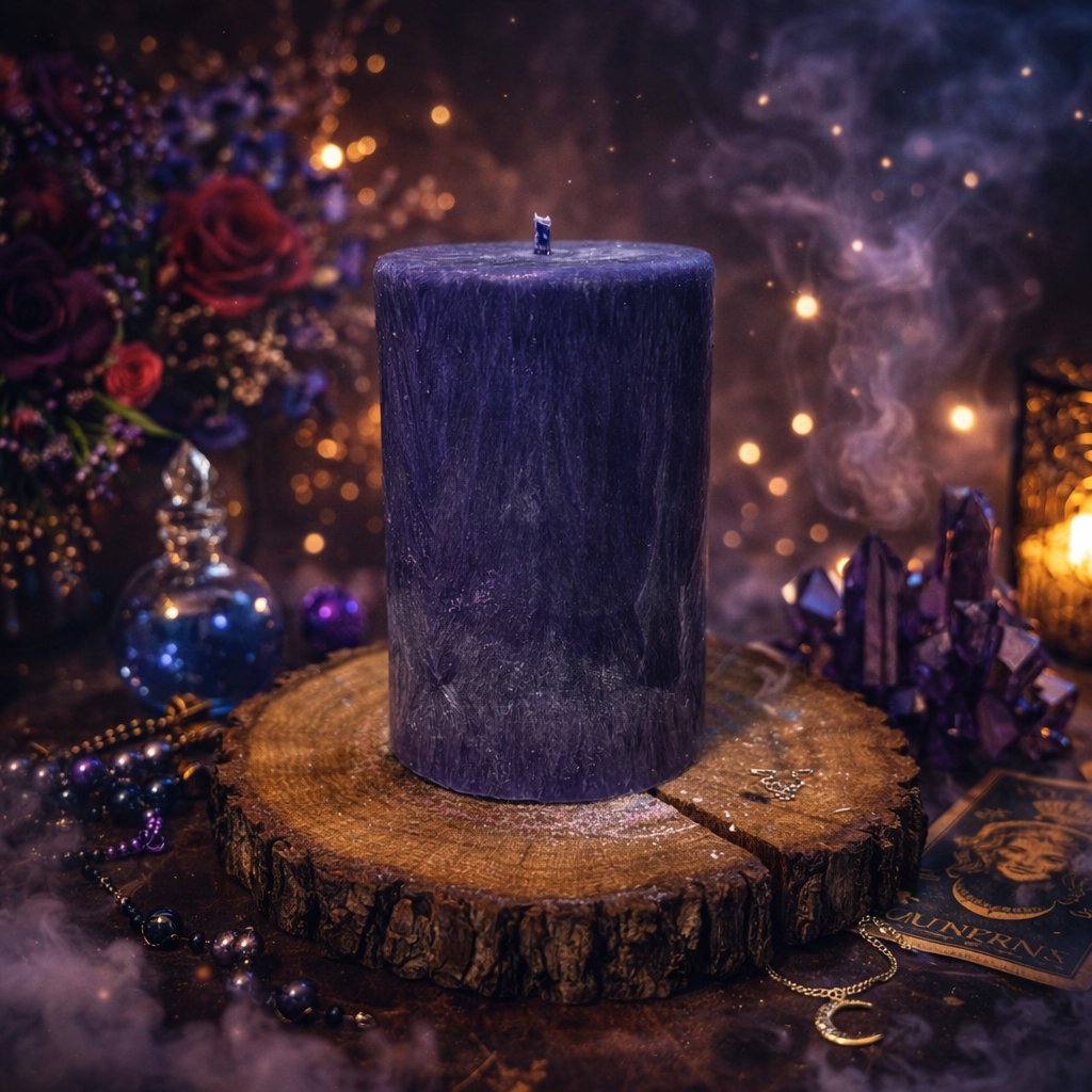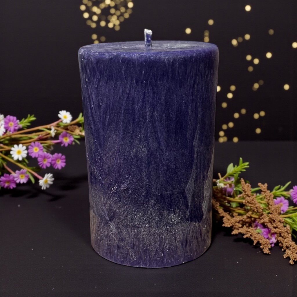 Tato svíčka je umělecké dílo. Její fialovo-modrá barva připomíná hluboký vesmír a její povrch hází odlesky jako miliony hvězd na noční obloze.